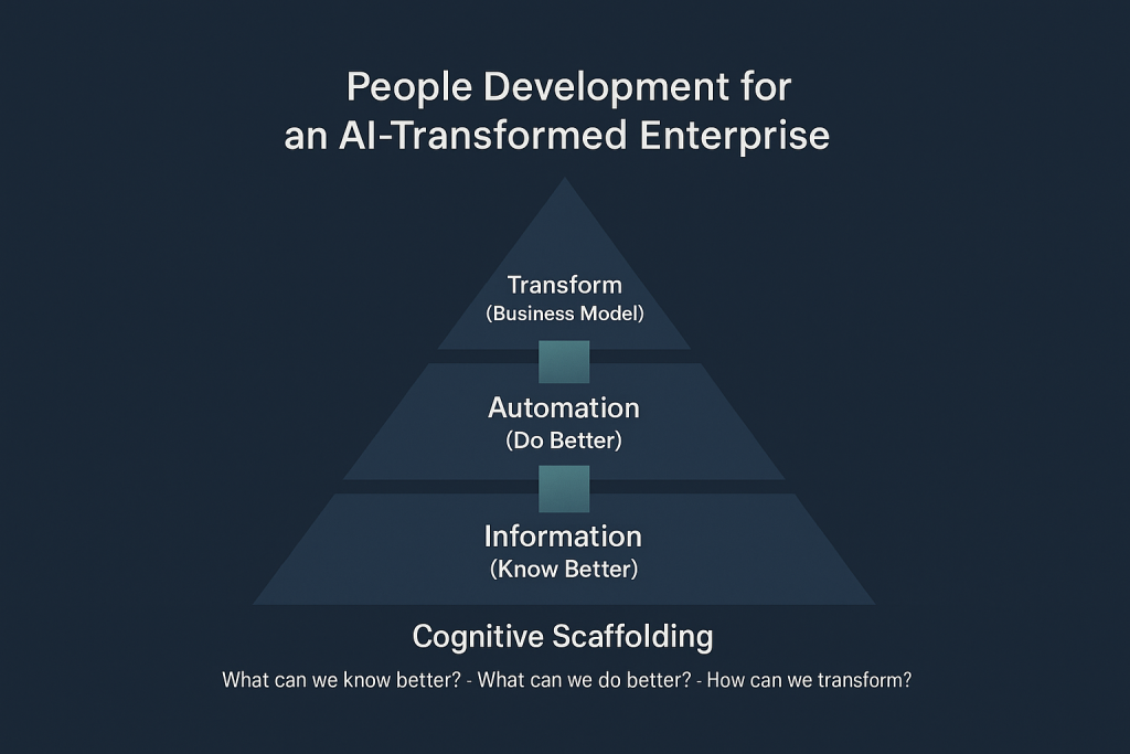 In the sections that follow, we outline this three-part framework—What can we know better? What can we do better? How can we transform?—and why it matters. We contrast fragmented tool training with strategic capability building, introduce the concept of cognitive scaffolding for individual growth, and show how combining organizational automation with individual augmentation can lead to true business model transformation. Finally, we provide actionable recommendations for CEOs and leadership teams to start developing “AI orchestration” skills across their workforce, ensuring their people—not just their technology—are ready for an AI-driven future.